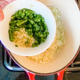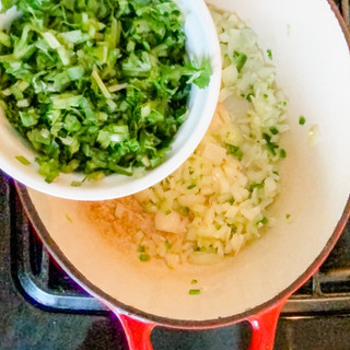Heat olive oil in medium sized pot on medium heat. Add chopped onions and sauté until soft. Add minced jalapeño and garlic and sauté until fragrant, about 2 minutes. Stir in chopped cilantro, chili powder, cumin, oregano, garlic powder and cinnamon.