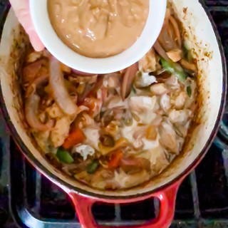 Add snow peas, fish sauce, peanut butter and one can of coconut milk. Add chicken back into pan and stir. Bring to a boil, reduce heat, cover and simmer until vegetables and chicken are just cooked through.